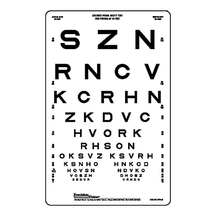 (9" x 14") Sloan optotype chart for vision testing at 10 feet. Features two smaller groups 10/20 to 10/8 for repetitive eyesight testing (20/40 to 20/16 equivalent). May be wall mounted or used with illuminated cabinets (66003, 66004, 66016, 66090).
