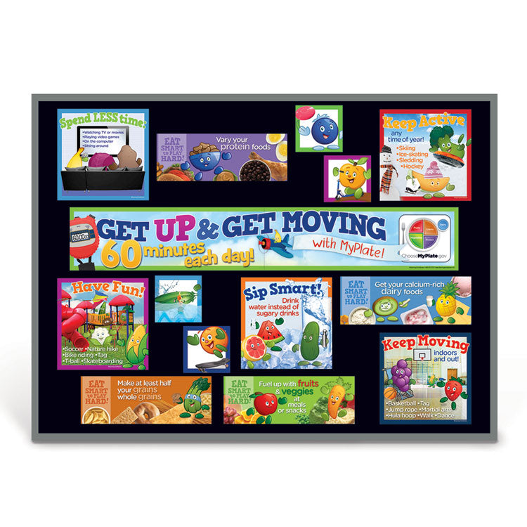 Included in the Active Kids MyPlate Bulletin Board Kit are two 5 1/2" x 17" title header pieces and a variety of informative cards. All pieces are laminated for durability. Sizes for 3'x 4' bulletin board.