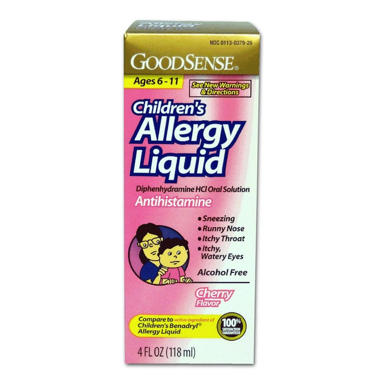 Children's strength Diphenhydramine HCl, oral suspension. Antihistamine that temporarily relieves runny nose, sneezing, itchy, watery eyes, and itching of the nose or throat. Alcohol-free. Cherry flavor. For ages 6–11.