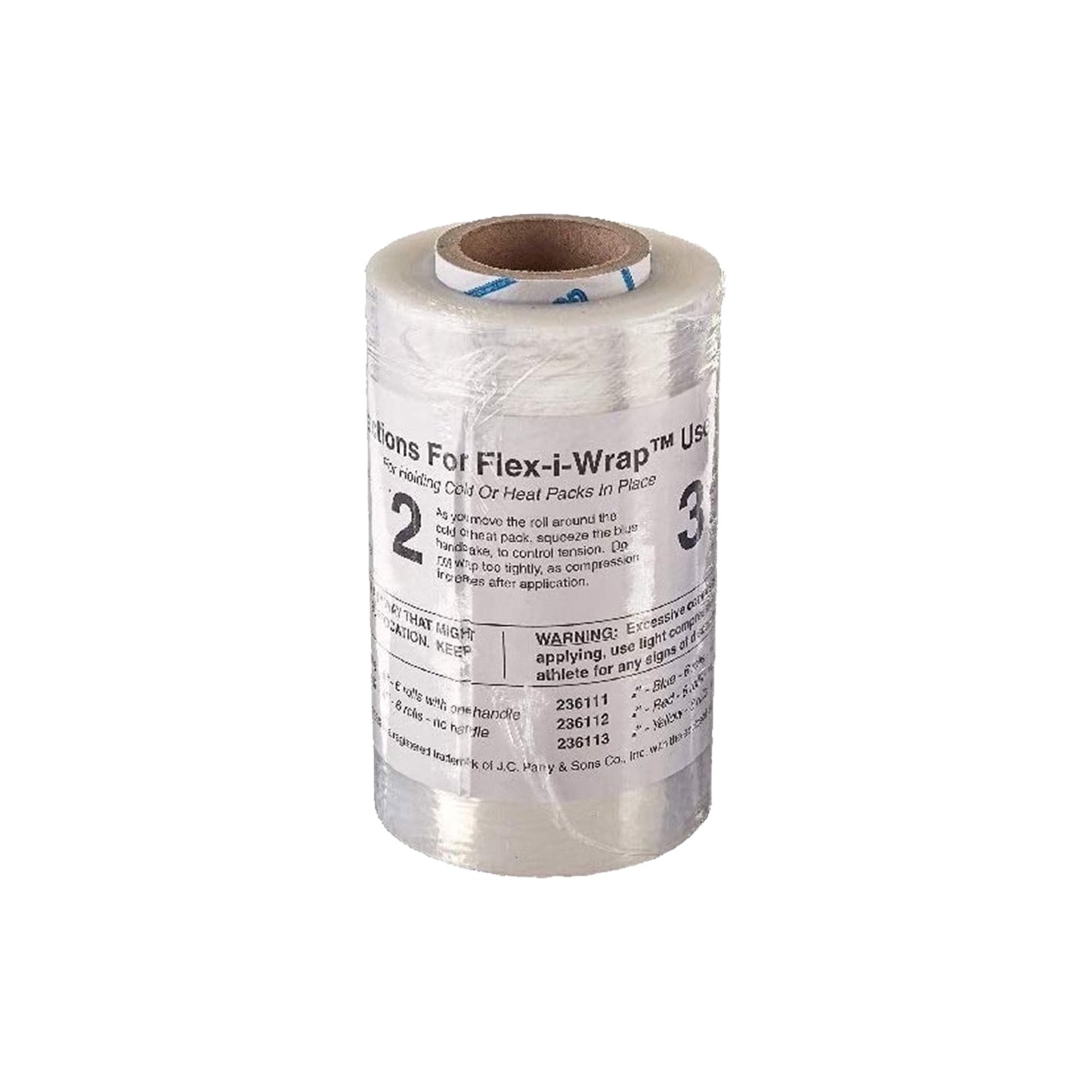 Flex-i-Wrap replaces elastic wrap at a fraction of the cost. It provides compression while the clear film allows inspection of injury. The patented, build-in hand brake on roller makes tearing easier. This wrap is self-adhering.