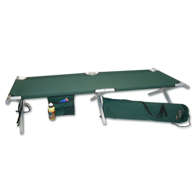Double layer Ripstop, weather resistant canvas with matching carrying case and a generous side pouch with multiple pockets make this a sturdy, reliable cot. Weight Capacity: 375 lbs.