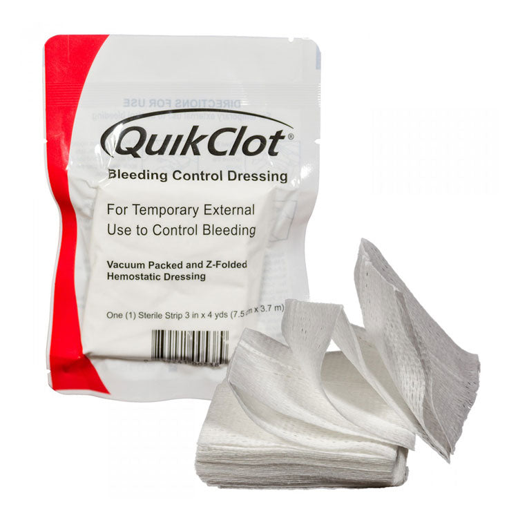 Utilizing the same fast-acting technology adopted by the U.S. military for years to save lives. The dressing works fast by accelerating the body's natural clotting process using a proprietary, inert, inorganic material impregnated into an easy-to-use gauze that will not break down or fall apart under pressure. Helps blood clot up to five times faster than blood on its own, and can control bleeding within minutes of application. 3 year shelf life. Sterile. Z-fold.