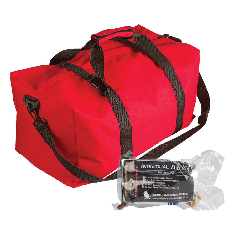 Each kit is designed to treat bleeding from penetrating and other traumatic injuries. The items in each kit are simple to use by non-medically trained caregivers. The purpose of this kit is to control bleeding and cover penetrating injuries until medically trained responders arrive on the scene. The School Mass Incident Kit contains 40 Individual Aid Kits packaged in a medium-sized duffle style bag designed to be carried over the shoulder or hand carried.