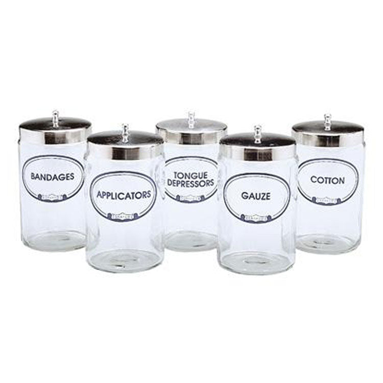 Each set of glass sundry jars is imprinted in blue with the following labels: Applicators, Cotton, Bandages, Gauze and Tongue Depressors.