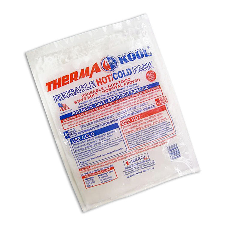 ThermaKool reusable gel packs are designed to provide comfortable pain relief when cold or hot therapy is required. ThermaKool remains flexible when frozen for up to 30 minutes and is safe for microwavable use. Use cold for the treatment of sprains, strains, headaches, contusions, bruises and minor bleeding/burns. Use hot therapy for temporary relief of muscle stiffness, aches and pains. Hospital proven, latex free, non-toxic and easy to clean for reuse. Preferred by School Nurse!